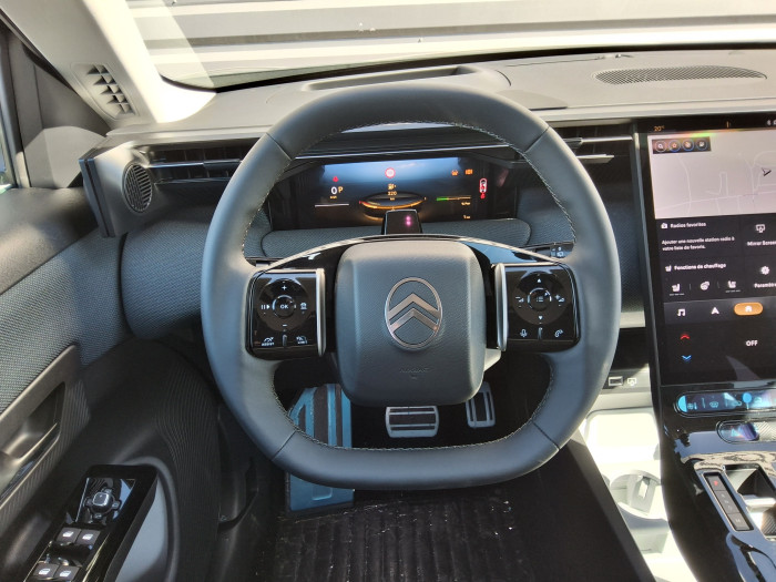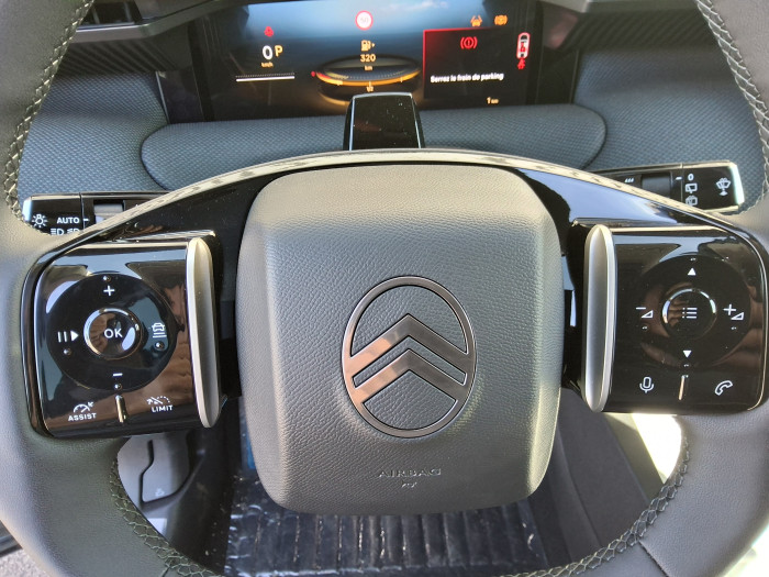 1 prise USB type-C retroeclairees a lAV (charge)2 prises USB type-C retroeclairees a lAR console centrale (charge)3 prises 12VABS, ESPAcces et demarrage mains libres ProximityAccoudoir central AV avec rangement ferme et refrigereAerateurs de climatisation centraux pour les passagers ARAffichage Tete Haute EtenduAide au stationnement ARAide au stationnement AV avec VisioPark 360°Allumage adaptative des feux de croisementAllumage automatique des feux de croisementApple CarPlay et Android Auto sans filBanquette AR avec dossier rabattable 40/20/40Banquette AR avec dossiers inclinables et accoudoir centralBluetooth (connexion simultanee 2 telephones)Boite automatique 6 rapportsBoitier telematique: Appel durgence et Citroen AssistanceCalandre Noir BrillantCalandre Noir MatClean Cabin avec detecteur de qualite de lairClimatisation automatique bizone etendueColor Clip Gold SatinCombine numerique 10" personnalisableControle de la presion des pneusCoques de retroviseurs exterieurs Noir BrillantDemarrage mains libresDirection assisteeEclairage dambiance etendu, 8 couleursEclairage interieur LEDEcran Cascade avec Navigation 3D ConnecteeEcran central vertical 13" tactileEquipements de securiteEssuie-vitres AV automatique Magic WashFeux AR a LED Citroen Light WingsFeux diurnes avec clignotants a LEDFrein de stationnement electriqueGarnissage Tissu Blue / Toile enduite Premium BlueHayons motorise mains libresJantes alliage 19" ZIRCONELeve-vitres electriques AV/AR sequentiels anti-pincementPack DesignPack Drive Assist 2.0Pack SafetyPare-brise acoustiquePare-brise feuilletePedalier et repose pieds aluminiumPlancher de coffre modulable a 2 positionsPoignees de maintien couleur chromePoignees de portes exterieures couleur caissePredisposition attelageProjecteurs Citroen Matrix LEDRecharge sans fil pour smartphoneRetroviseur interieur electrochromeRetroviseurs exterieurs electriques degivrantsRetroviseurs exterieurs rabattables electriquement avec eclairage daccueil a LEDSelecteur de mode de conduiteServices Connect PLUSSiege conducteur a reglage electrique (8 directions) avec memoire de positionSieges AV chauffantsSuspension Citroen Advanced ComfortSysteme audio 6 HP (DAB+)TCS (Controle de la traction)Verrouillage centraliseVitres AR, vitres de custode et lunette AR surteinteesVitres AV electriquesVolant chauffantVolant gaine multifonctions avec decor Noir Brillant