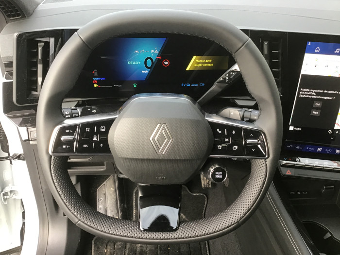 2 prises USB a l'AV et a l'ARABS avec aide au freinage d'urgenceAide au freinage d'urgenceAirbags frontaux (conducteur et passager)Airbags lateraux bassin / thorax conducteur et passager AVAirbags lateraux, milieu AV et rideauxAlerte de distance de securiteAlerte detection de fatigueAlerte franchissement de ligne et assistant maintien dans la voieAppel d'urgenceAvertisseur d'angle mort et prevention sortie de voie en cas de depassementAvertisseur de sortie de stationnement en marche AR avec freinage d'urgence automatiqueBanquette AR coulissante 1/3-2/3 avec accoudoir centralBarres de toit longitudinalesCamera 3D vision 360°Carte Renault acces et demarrage mains libresChargeur smartphone a inductionCiel de toit gris anthraciteClignotants AR dynamiquesClimatisation automatique bi-zoneCommutation automatique des feux de route/croisementConsole centrale avec repose main coulissantDetection intelligente des limitations de vitesse et prevention survitesseEasy park assist et aides au parking AV, AR et lateraleEclairage d'accompagnement au sol avec projection logoFaux plancher de coffreFeux AR a LED avec effet 3DFeux AV full LED Adaptative VisionFeux de jour a LEDFrein de parking electrique avec fonction Auto-HoldHayon motorise main libreInsert de tableau de bord en bois veritableJantes alliage 20" Effie diamantees noirKit de gonflageLeve-vitres AR electriques a impulsionLeve-vitres AV electriques a impulsionLumiere d'ambiance personnalisableMiroir de surveillance enfantsMulti-senseMy Safety switchNavigation Google MapsPalettes au volantRegulateur de vitesse adaptatifRetroviseur interieur electrochrome sans cadreRetroviseurs exterieurs electriques a memoire, degivrants, rabattables automatiquementSellerie mixte / tissu noir avec surpiqures or/ textile enduit graineSeuil de portesSiege conducteur electrique avec reglage lombaire et fonction massageSieges AV chauffantsSortie securisee des occupantsSysteme de surveillance de la pression des pneusSysteme Multimedia openR link 12" : navigation, services Google, audio Arkamys AuditoriumTableau de bord full numerique 12,3''Volant chauffantVolant reglable en hauteur et profondeur